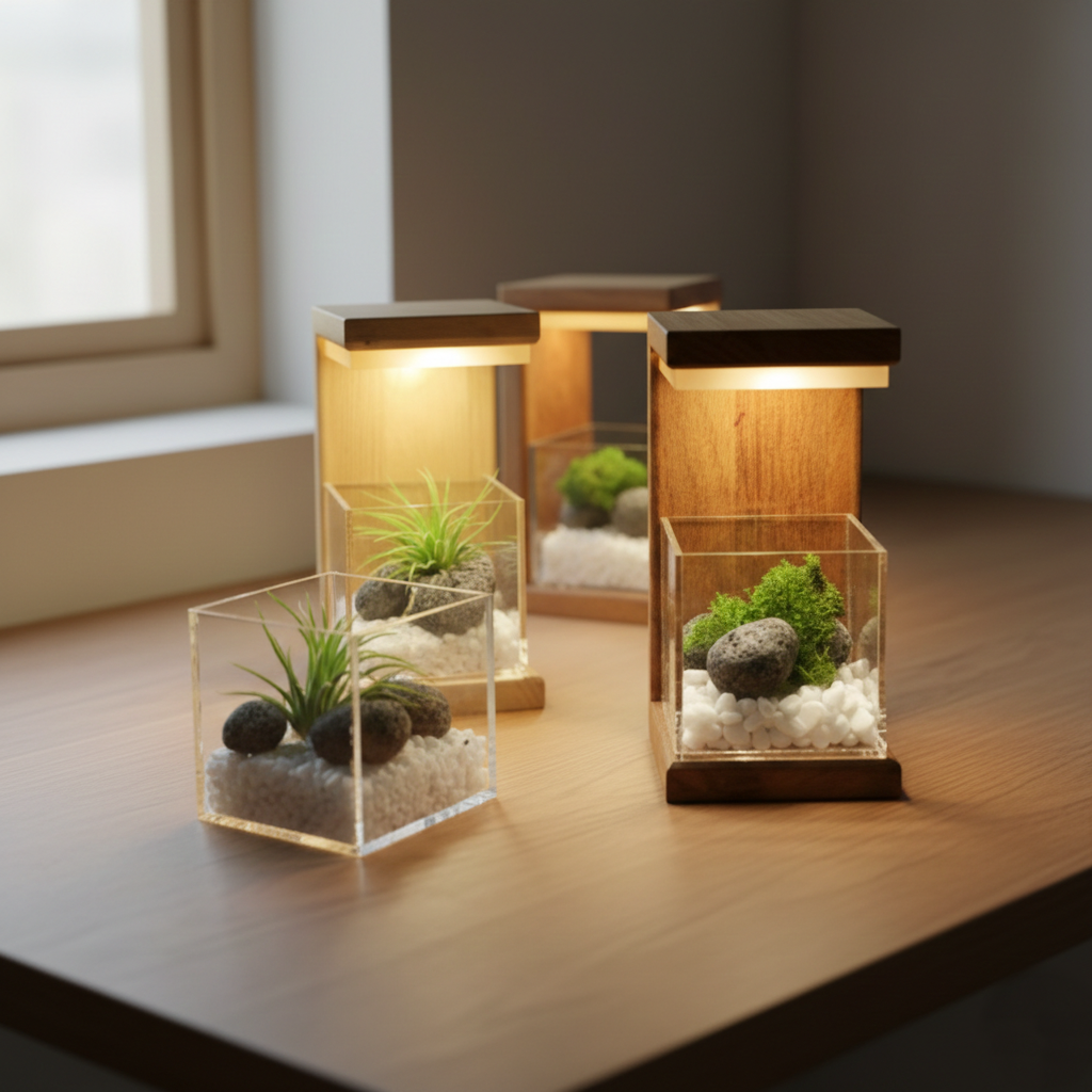 Bring nature and light together with this elegant wooden LED terrarium lamp. Featuring a clear acrylic box filled with decorative stones and lush artificial plants, it creates a calming, modern aesthetic. The warm built-in LED light adds a cozy glow, perfect for home or office décor. A stylish blend of wood and greenery that enhances any space effortlessly.