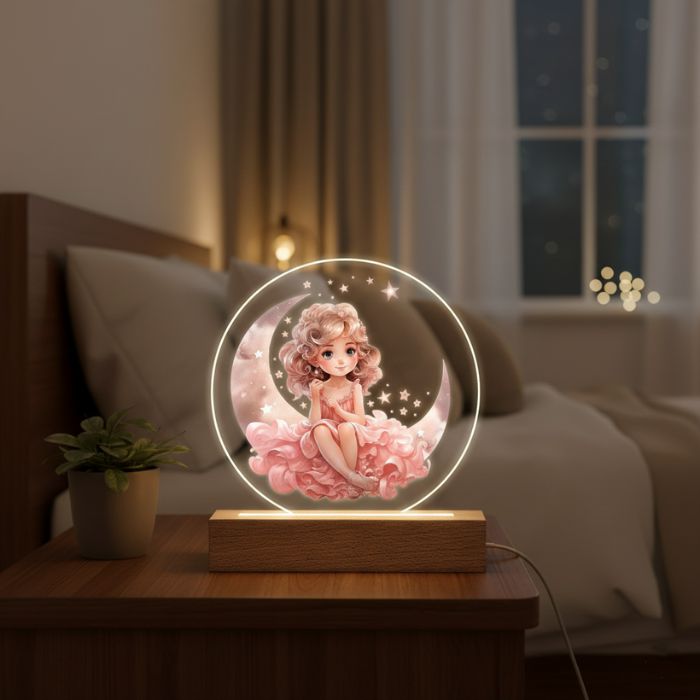 This personalized LED acrylic night lamp features a beautiful custom name design with an adorable girl and bunny artwork. It gives a soft, warm glow that creates a cozy and comforting atmosphere in any kids’ room or nursery. Crafted with premium acrylic and an elegant wooden base, it is both durable and stylish. A perfect keepsake gift for birthdays, baby showers, and special occasions.